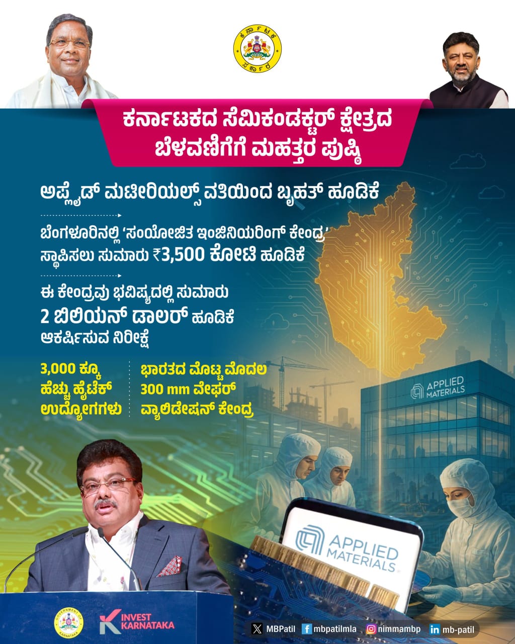 ಧನ್ಯವಾದಗಳು @Applied4Tech — ಕರ್ನಾಟಕದ ಬೆಳವಣಿಗೆಯ ಕಥೆಗೂ, ಸೆಮಿಕಂಡಕ್ಟರ್ ಸಾಹಸಕ್ಕೂ ನೀವು ಅಮೂಲ್ಯ ಸಹಭಾಗಿಗಳಾಗಿದ್ದೀರಿ ಎಂದು ಪಾಟೀಲ್ ತಿಳಿಸಿದ್ದಾರೆ.