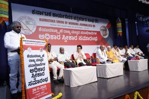 ಐಎ್ಡಬ್ಲ್ಯುಜೆ ಅಧ್ಯಕ್ಷ ಬಿ.ವಿ.ಮಲ್ಲಿಕಾರ್ಜುನಯ್ಯ, ಕೆಯುಡಬ್ಲೂಜೆ ರಾಜ್ಯ ಉಪಾಧ್ಯಕ್ಷರಾದ ಎಚ್.ಬಿ.ಮದನಗೌಡ, ಮತ್ತಿಕೆರೆ ಜಯರಾಂ, ಅಜ್ಜಮಾಡ ಕುಟ್ಟಪ್ಪ, ಪ್ರಧಾನ ಕಾರ್ಯದರ್ಶಿ ಜಿ.ಸಿ.ಲೋಕೇಶ, ಕಾರ್ಯದರ್ಶಿಗಳಾದ ನಿಂಗಪ್ಪ ಚಾವಡಿ, ಸೋಮಶೇಖರ ಕೆರಗೋಡು, ಪುಂಡಲೀಕ ಭಾಳೋಜಿ, ಖಜಾಂಚಿ ವಾಸುದೇವ ಹೊಳ್ಳ ವೇದಿಕೆಯಲ್ಲಿದ್ದರು.