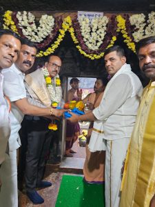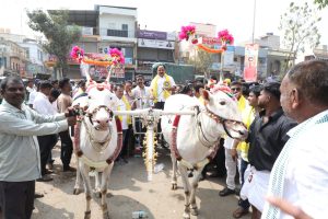 ಸಚಿವ ಡಿ ಸುಧಾಕರ್ ರವರನ್ನು ಮುಖ್ಯರಸ್ತೆಯಿಂದ ದೇವಸ್ಥಾನದವರೆಗೆ ಅಲಂಕಾರಗೊಂಡ ಎತ್ತಿನಗಾಡಿಯಲ್ಲಿ ಕರೆತರಲಾಯಿತು.